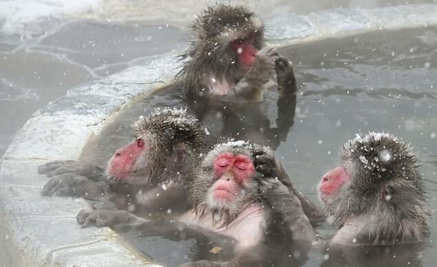有的猴子将雪花像毛巾一样顶在头上,有的则将双臂搭在浴池边悠然地向外眺望,还有的互相梳理毛发。从福冈市来旅游的57岁主妇笑着说:“泡完温泉可能会冷,真想帮它们擦一擦。”