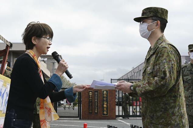 来自反对部署的市民团体的海北由希子(57岁、熊本市)向驻地队员递交了致防卫相小泉进次郎等人的请愿书,并质问道:“这种一再践踏居民人权、强行推进的安全保障究竟是为了什么,又是为了谁?”
