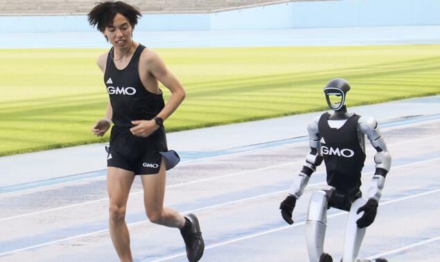 【共同社4月2日电】日本GMO互联网集团2日宣布,将把本公司田径部运动员的跑步动作作为学习数据,用于人形机器人系统开发。GMO旗下拥有曾在著名登山赛段箱根驿传5区有封神表现的黑田朝日。公司希望通过吸收运动员的高超跑步技术,使机器人能够稳定行走和奔跑。GMO当天在川崎市的一处田径场展示了一台身高1.27米的人形机器人奔跑的样子。据称该机器人奔跑可达时速约11公里。与其并跑的黑田表示:“看到它能稳稳地跑起来,感到这是水平很高的技术。”