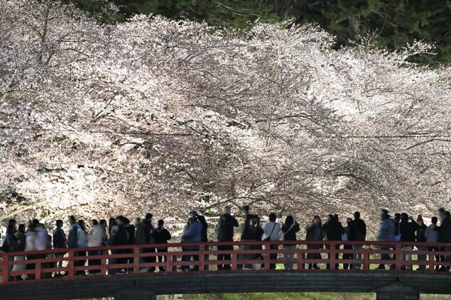 【共同社4月17日电】日本赏樱胜地青森县弘前市的弘前公园15日迎来樱花的最佳观赏期,染井吉野樱等几近盛放。受3至4月气温偏高影响,今年开花时间较往年提前了约11天,创下观测史上第二早纪录。公园内正在举办“弘前樱花节”,将持续至5月5日。